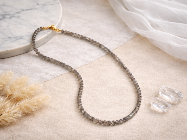 Délicat et lumineux, ce collier en Labradorite naturelle est composé de fines perles de 4 mm sublimées par un fermoir en acier doré. Ses reflets subtils gris aux éclats irisés apportent élégance et mystère à votre tenue.
