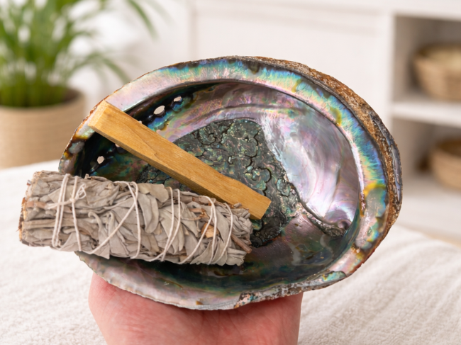 La coquille d’ormeau est utilisée comme support de fumigation pour la sauge, le palo santo ou les encens.